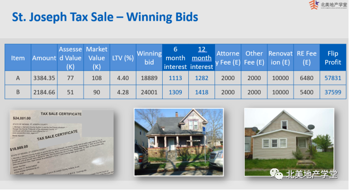 如果房主不在一年内赎回的话,粗算一下,拿到这个房子进行翻新,扣除拍卖价格及后续所有费用之后,第一个房子可以获得57,831美元的利润,另一个可以获得37,599美元的利润,还是比较可观的。